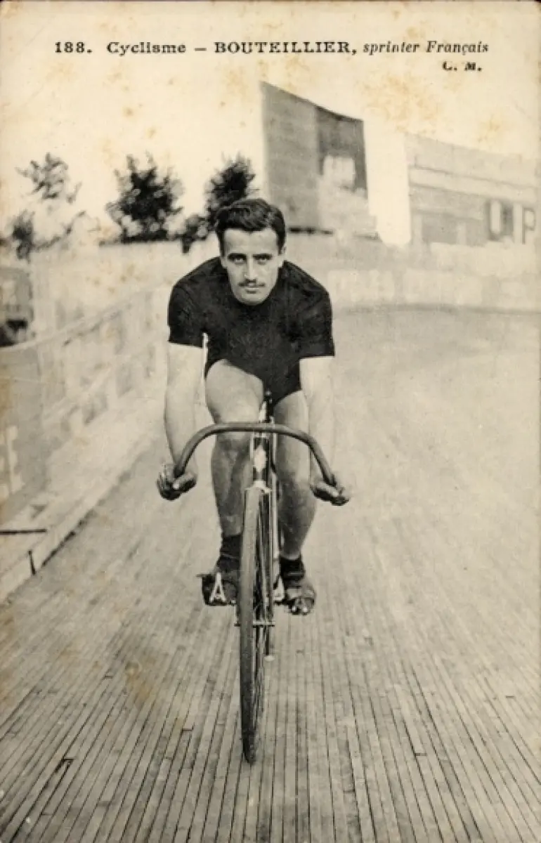 Ak Radrennsport, Radrennfahrer Bouteillier, französischer Sprinter, Radrennbahn