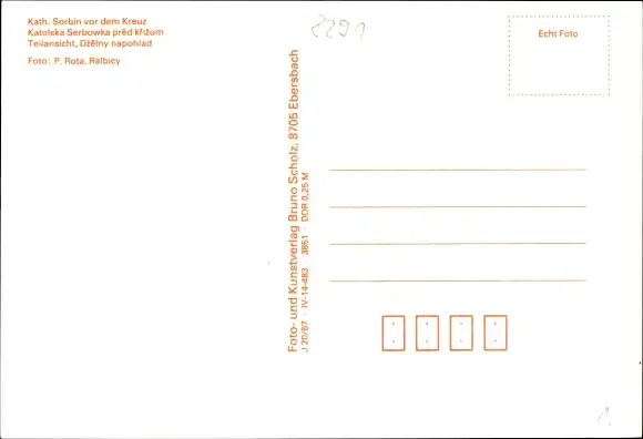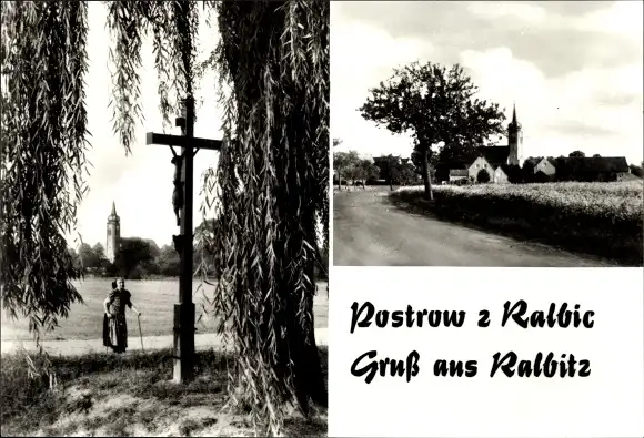 Ak Ralbitz Rosenthal Oberlausitz, Kath. Sorbin vor dem Kreuz, Panorama mit Kirche
