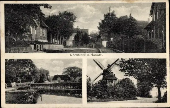 Ak Ramstedt in Nordfriesland, Windmühle, Ortsansichten