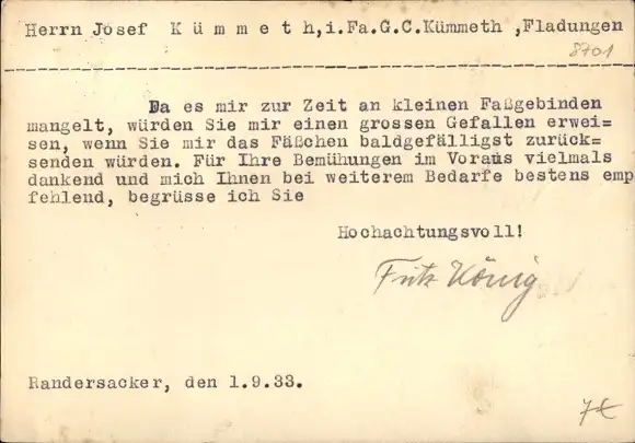 Ak Randersacker am Main Unterfranken, Weinkellerei König, Bestellung