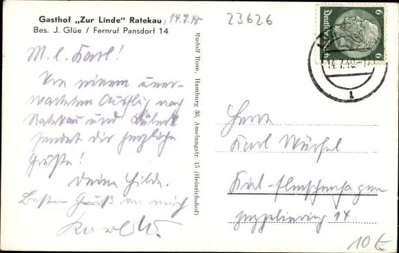 Zustand, siehe Scan, gelaufen, 1940- Inh. J. Glüe - ca 9 cm X 14 cm