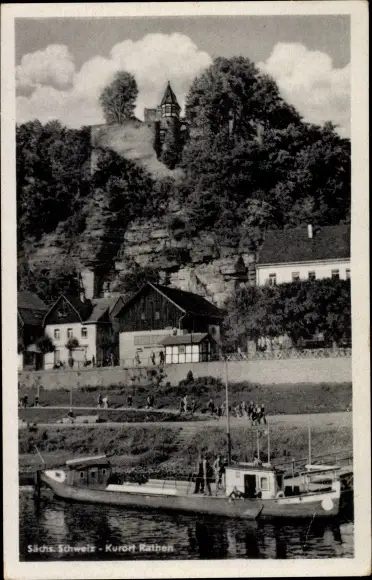 Ak Rathen an der Elbe Sächsische Schweiz, Teilansicht, Boot, Anlegestelle