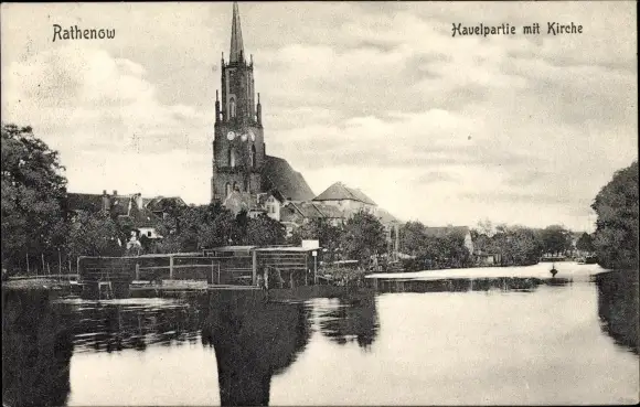 Ak Rathenow,Havelpartie mit Kirchenansicht,Anlegestelle