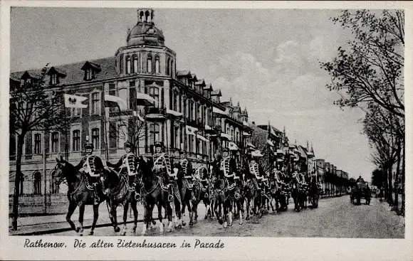 Ak Rathenow im Havelland, Die alten Zietenhusaren in Parade, Reiter, historische Uniformen