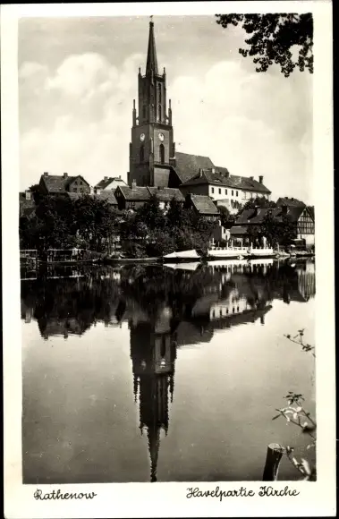 Ak Rathenow im Havelland, Havelpartie an der Kirche