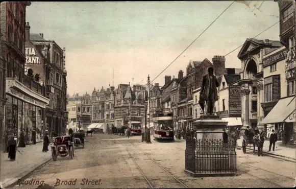 Ak Reading South East, Broad Street, Monument, Straßenbahnen