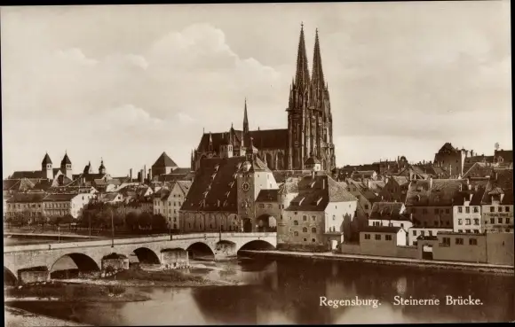 Ak Regensburg an der Donau Oberpfalz, Stadt mit steinerner Brücke