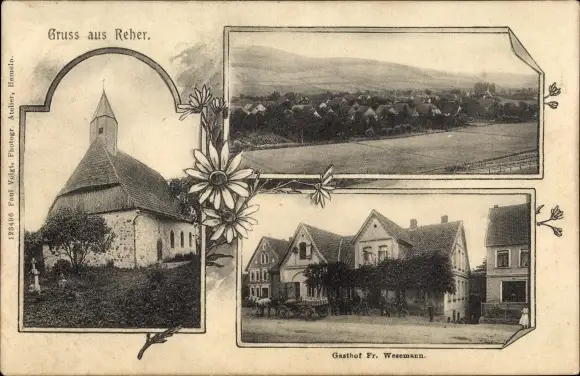 Ak Reher Steinburg in Holstein, Gesamtansicht, Kirche, Gasthof Fr. Wesemann