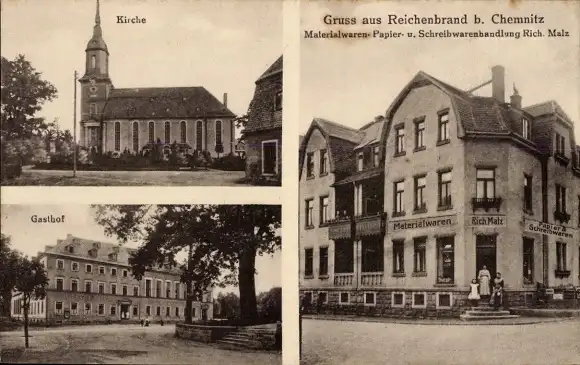 Ak Reichenbrand Chemnitz in Sachsen, Gasthof, Kirche, Materialwarenhandlung