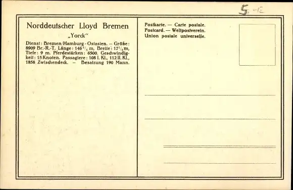 Ak Reichspostdampfer Yorck, Norddeutscher Lloyd Bremen