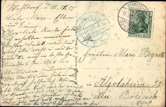 gelaufen 1915, Poststempel geprüft zu befördern, Eckknick rechts oben, leicht fleckig, sonst guter Zustand