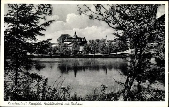 Ak Reinfeld in Schleswig Holstein, Partie am Neuhöferteich mit Durchblick zum Rathaus