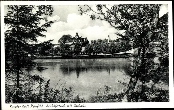 Ak Reinfeld in Schleswig Holstein, Partie am Neuhöferteich mit Durchblick zum Rathaus