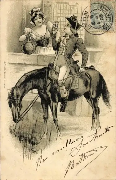 Ak Reiter mit Weinglas, Frau mit Weinkrug