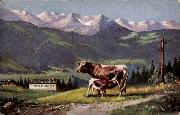 Ak Reklame, Chocolat Cailler, Rinder, Gebirge