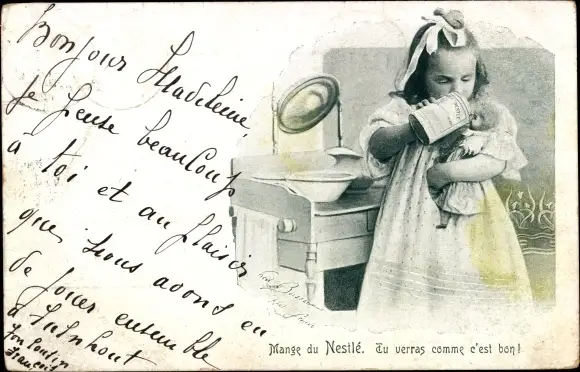 Ak Reklame, Nestle, Mädchen füttert Puppe
