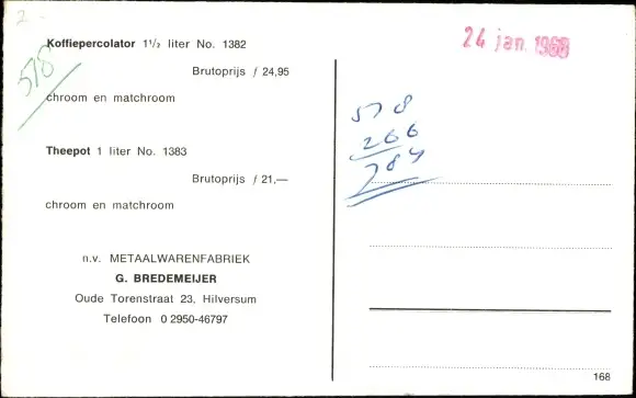 Ak Reklame, verchromte Kaffeekanne, Teekanne, Metaalwarenfabriek Bredemeijer, Hilversum