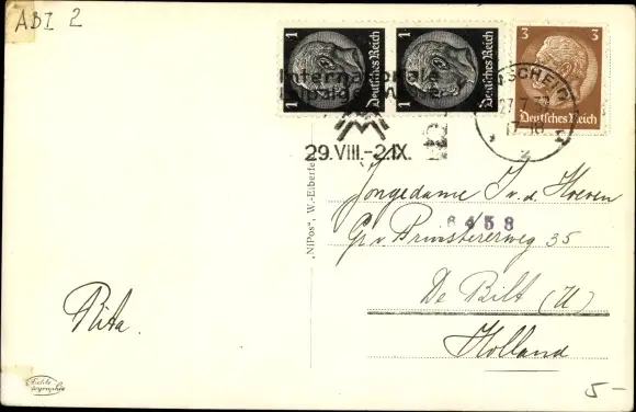 gelaufen 1937, leichte Stempelspur, rückseitig Klebe- u. Papierreste, sonst guter Zustand