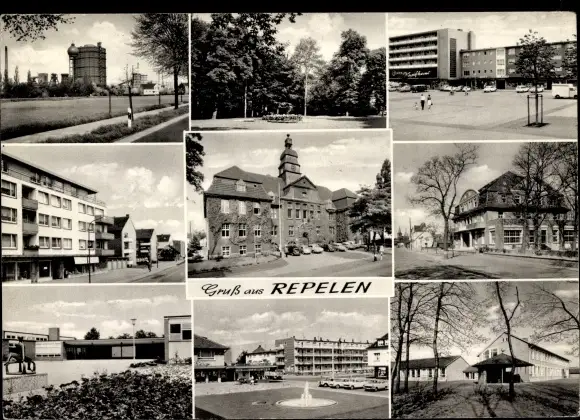 Ak Repelen Rheinkamp Moers am Niederrhein, Springbrunnen, Hochhaus