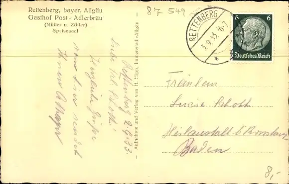 Zustand, siehe Scan, gelaufen, 1933- Inh. Müller und Zöller - ca 14 cm X 9 cm