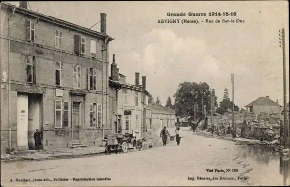 Ak Revigny Meuse, Rue de Bar le Duc, Auto, Kriegszerstörungen, I. WK
