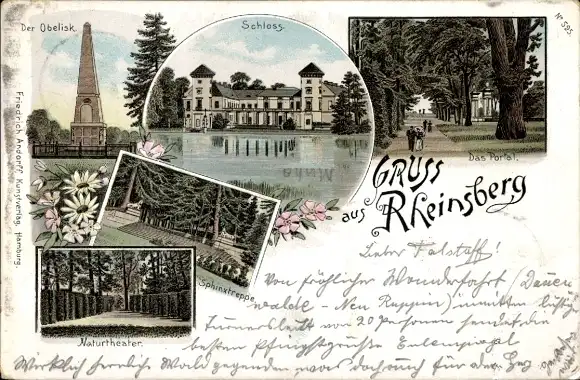 Ak Rheinsberg in der Mark, Obelisk, Schloss, Naturtheater, ntext in deutscher Sprache