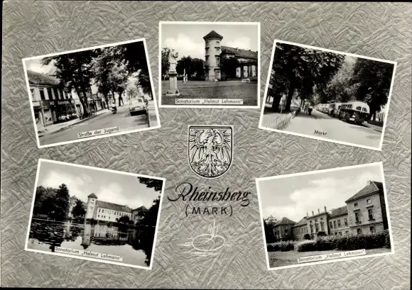 Ak Rheinsberg in der Mark, Straße der Jugend, Markt, Busse, Sanatorium Helmut Lehmann, Wappen