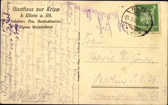 Zustand, siehe Scan, gelaufen, 1926- Inh. Frz. Brettschneider - ca 14 cm X 9 cm