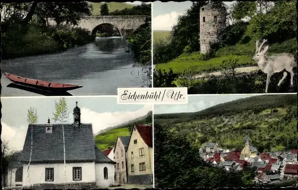 Ak Riedern Eichenbühl in Unterfranken, Teilansichten, Brücke, Kirche, Turm, Hirsch