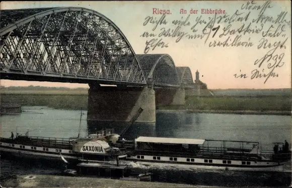 Ak Riesa an der Elbe Sachsen, An der Elbbrücke, Elbdampfer Saxonia mit klappbaren Schornstein