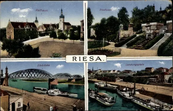 Ak Riesa an der Elbe Sachsen, Rathaus, Stadtpark, Elbbrücke, Landungsplatz, Elbdampfer