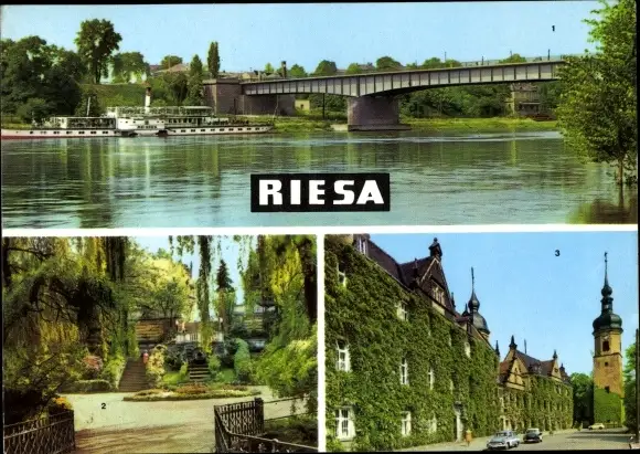 Ak Riesa an der Elbe Sachsen, Stadtpark, Rathaus, Brücke, Schiff