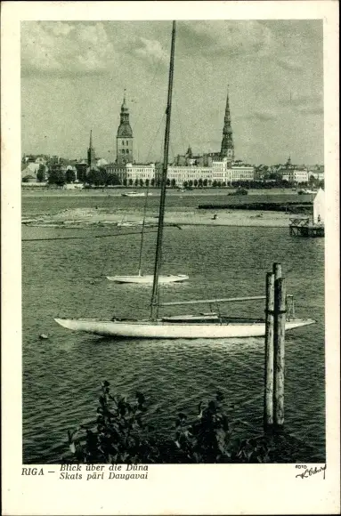 Ak Riga Lettland, Düna, Segelboote, Petrikirche, Teilansicht der Stadt