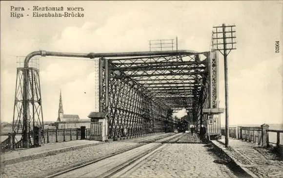 Ak Riga Lettland, Eisenbahn-Brücke, Stadtansicht, Architektur