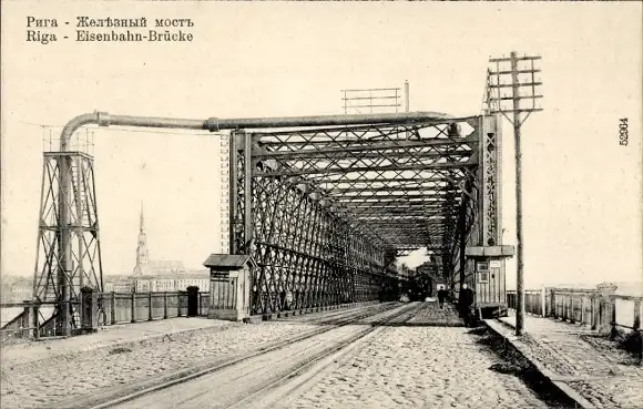 Ak Riga Lettland, Eisenbahnbrücke, Kirche, Dampflok