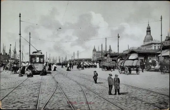 Ansichtskarte, Postkarte, Straßenbahn, Straßenbahnen, Tram, Hafen, Schiffe