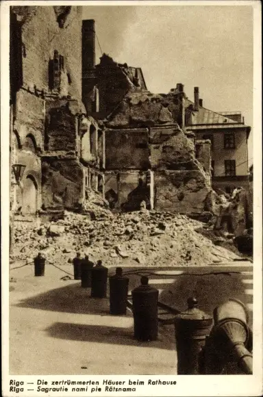 Ak Riga Lettland, Zertrümmerte Häuser, Rathaus