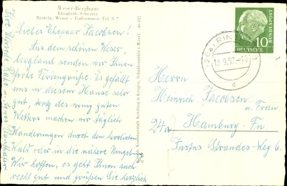 Zustand, siehe Scan, gelaufen, 1957- Inh. Elisabeth Scherrer - ca 14 cm X 9 cm