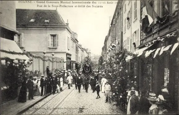 Ak Roanne Loire, Grand Concours Musical International 1908, Rue de la Sous Préfécture