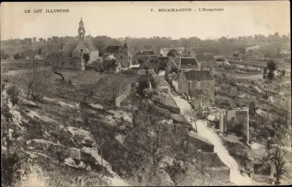 Ak Rocamadour Lot, vue générale d'oiseau du village, Église, L'Hospitalet