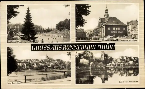 Ak Ronneburg in Thüringen, Schwimmbad, Rathaus, Markt, Baderteich, Schloss