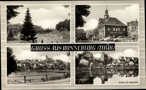 Ak Ronneburg in Thüringen, Schwimmbad, Rathaus, Markt, Baderteich, Schloss