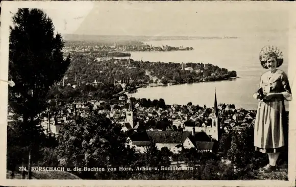 Ak Rorschach Kt. St. Gallen Schweiz, Buchten von Horn, Arbon u. Romanshorn, Frau in Tracht