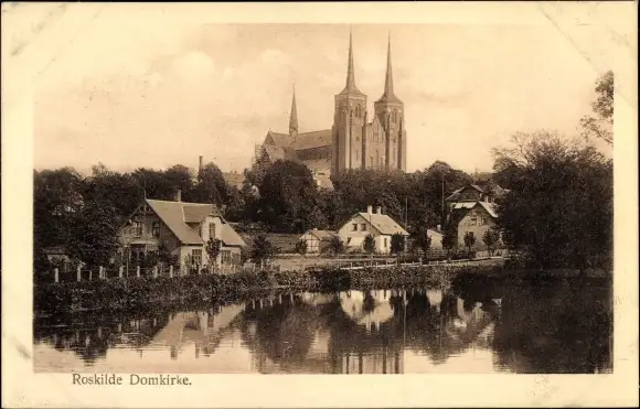 Ak Roskilde Dänemark, Kanalpartie mit Blick auf die Domkirche