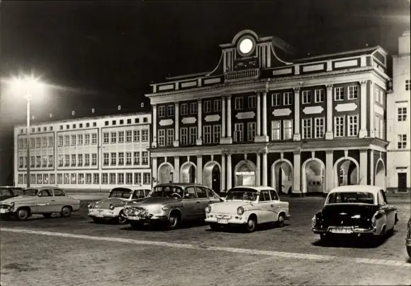 Ak Rostock, Partie am Rathaus bei Nacht, Parkplatz, Automobil IB 96 21