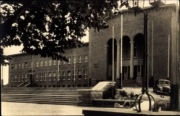 Ak Rostock, Schwimmhalle Neptun, Treppe, Eingang, Auto