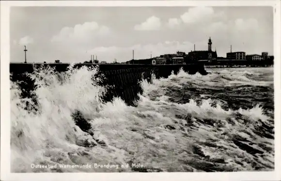 Ak Rostock Warnemünde, Brandung an der Mole, Leuchtturm