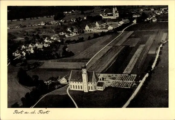 Ak Rot an der Rot in Württemberg, Luftaufnahme von Kirche, Felder, schwarz-weiß