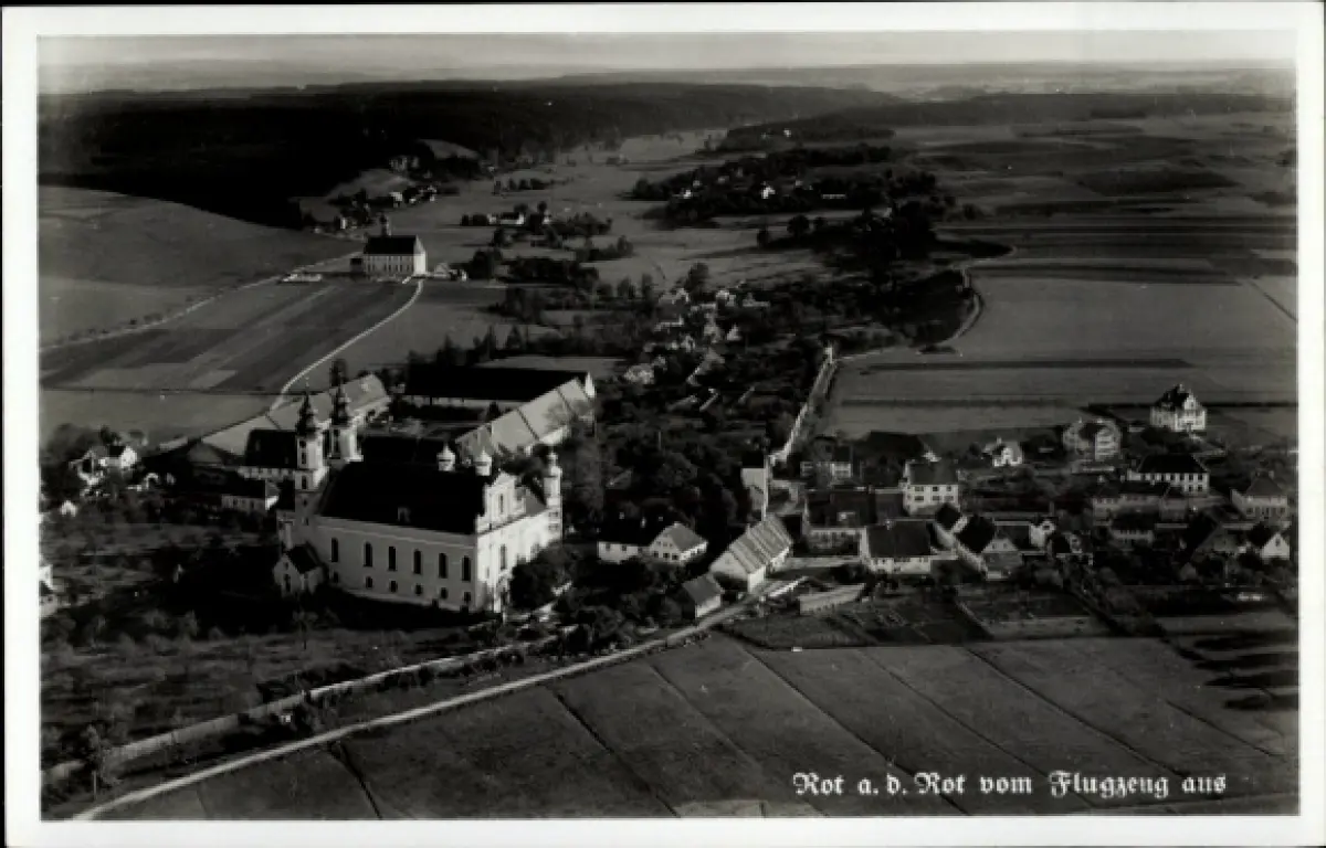 Ak Rot an der Rot in Württemberg, Luftaufnahme von Rot a. d. Rot, Kirche im Vordergrund, ländlich