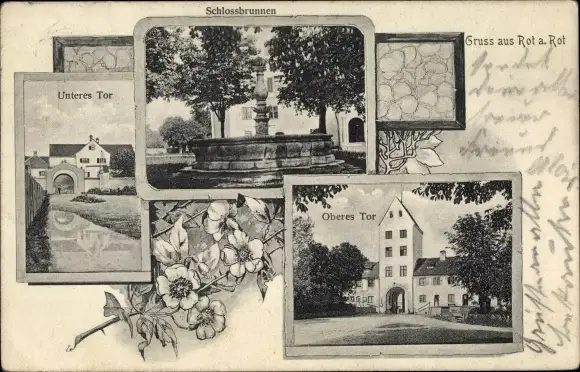 Ak Rot an der Rot in Württemberg, Schlossbrunnen, Oberes Tor, Unteres Tor
